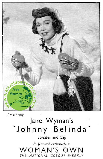 This is a little unusual as the pattern was offered by Woman's Own to mark the release of Johnny Belinda. The stamp on the back is for the Regent Cinema, Chatham, Kent with the date stamp of 7th March 1949. As far as I can tell neither the sweater, nor stocking cap get screen time and Jane Wyman's character in the film is a lot less glamorous.